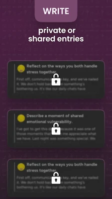 Main features: - Journal privately or together with your partner - Get unique journaling prompts and questions every day to inspire you to write - Set reminders to help you keep on track - Get notified when your partner writes an entry - Chat with your partner - Protect your app with a passcode - Customize your app with different color themes